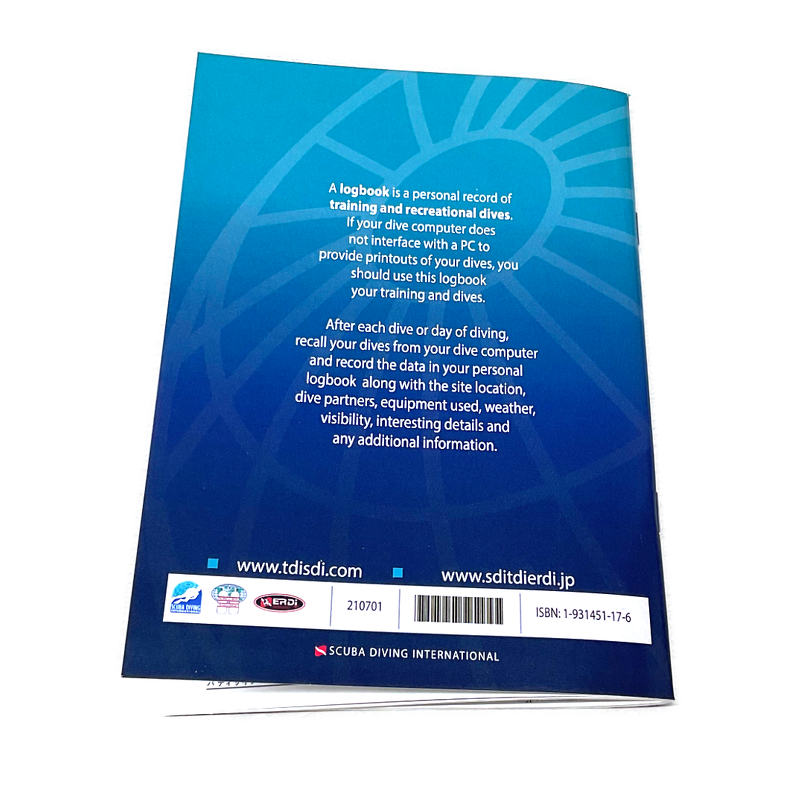 ログブックの表紙は、SDIらしい青色のグラデーションカラーで彩られています。これにより、ダイビングの魅力を引き立て、一目で目を引くデザインとなっています。
