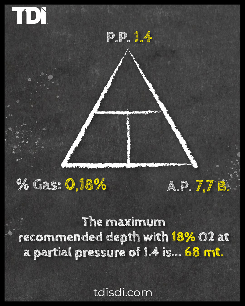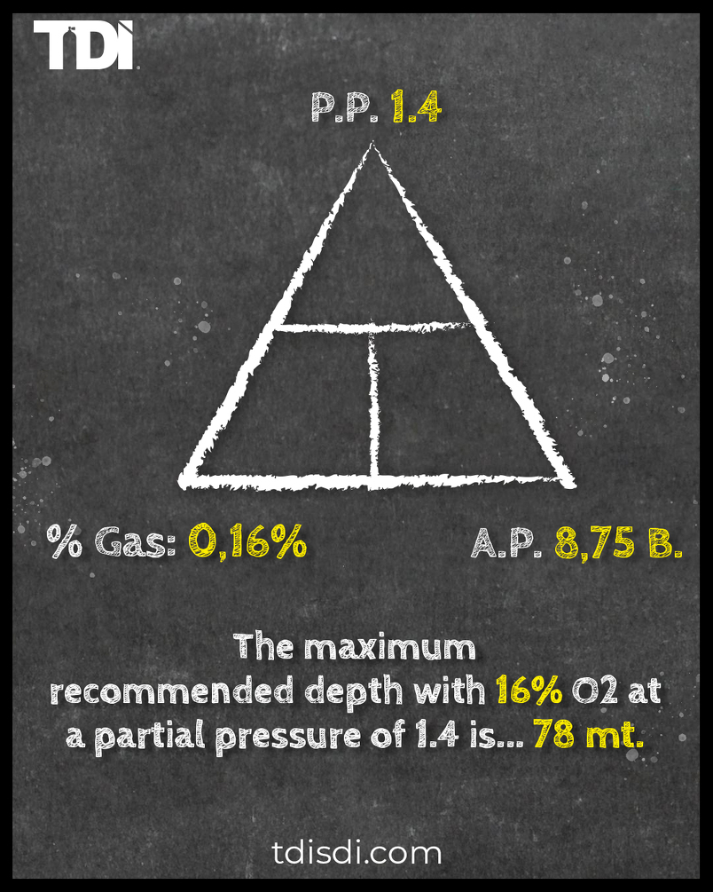 16%の酸素濃度はダイビング業界と医療専門家によって受け入れられている限界値で、これにより最大77mまでの潜水が可能になり、TDIトライミックスコースで学ぶ手順に従って2段階のガス変更のみで潜水できます。