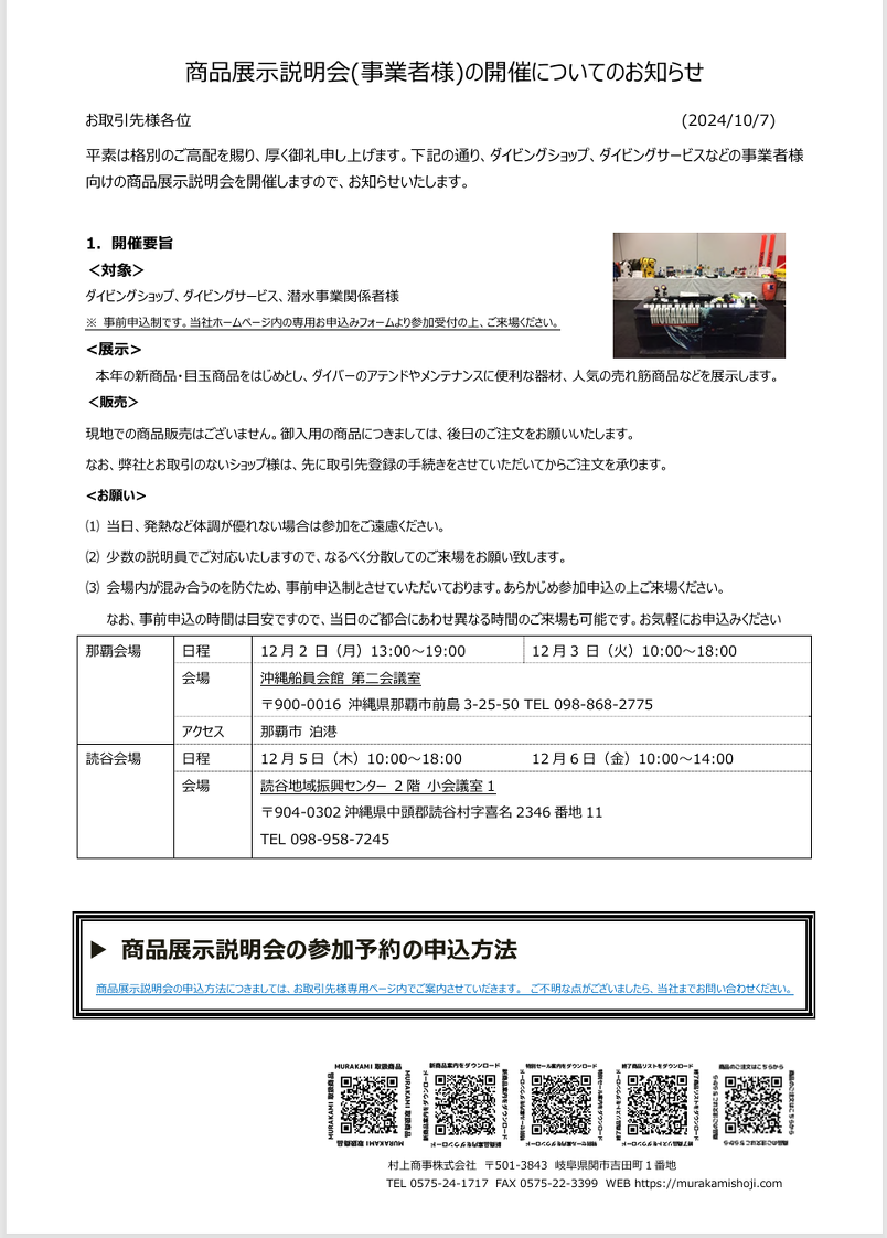 2024年12/2~6、沖縄にて、村上商事株式会社様の商品展⽰説明会が開催されます。