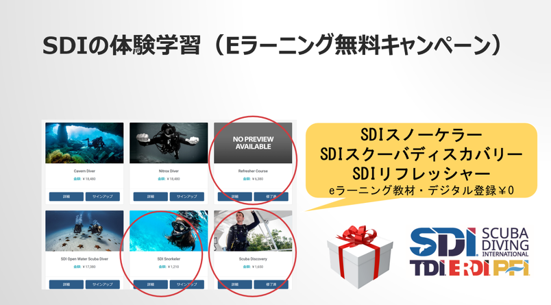 SDIはダイビングの質を高めるために、実技の前に、eラーニングを無料でご提供するキャンペーンを開催いたします!SDIファシリティ(キャンペーン推奨店)でお申し込みください。