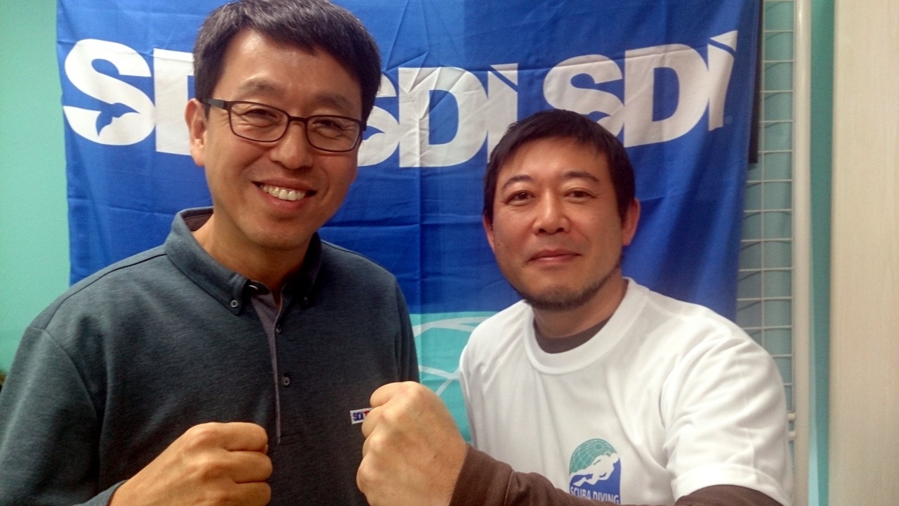 インストラクタートレーナーを誰がトレーニングを行うのかというと、アメリカ本部から認定されたインストラクタートレーナーエバリュエーターという本部が認めた世界に10名ほどしかいない凄腕トレーナーたちが指導を行います。今回のワークショップの開催に向け、アメリカ副社長のポールさんに相談したところ、やはりITE(インストラクタートレーナーエバリュエーター)に認定されていて、最もアジアで活躍している韓国代表のトラビスさんが、適役とのことで、来日していただきました。トラビスさんは、前事務局のTDI JAPAN初代事務局長だった安原さんにたいへんお世話になったそうで、今度は新生日本事務局に力になりたいといつもサポートしてもらっています。