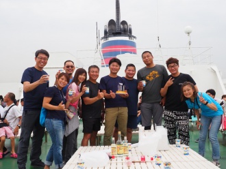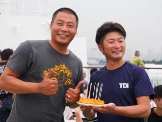出航日が、参加者二名のお誕生日ということで、ベイブリッジみながらバースデーパーティ。