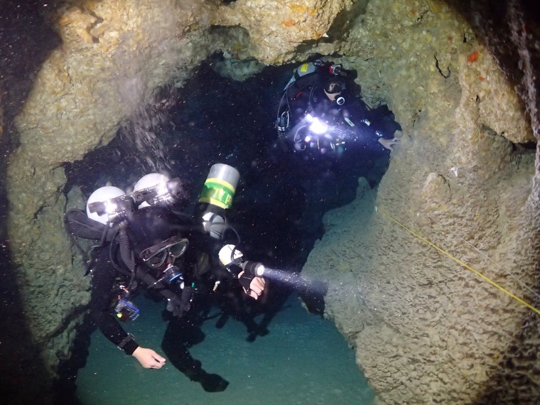 当店受講生とともに沖縄県久米島の海底洞窟の調査では国内最長水中洞窟であること、また京丹後では国内最長の半水面洞窟であることなどを確認しました。